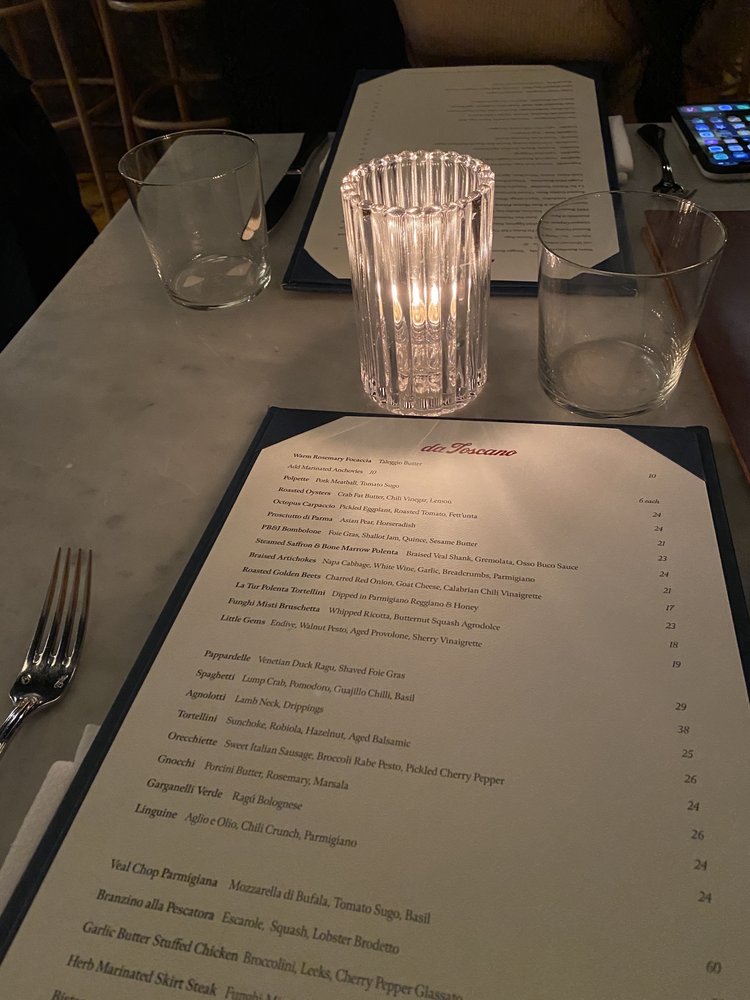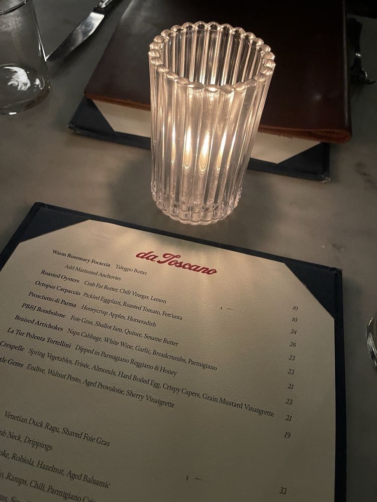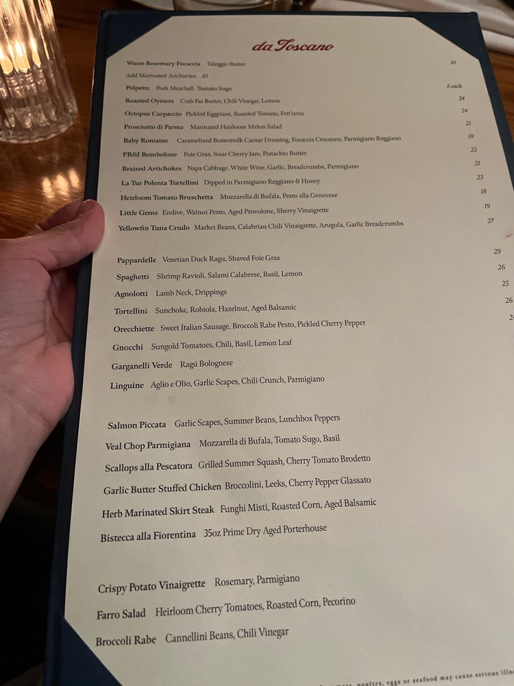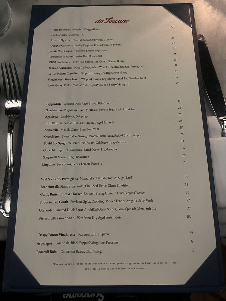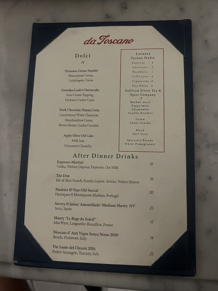 Introducing the menu at Da Toscano, a trendy Italian restaurant located in New York's West Village. This upscale establishment offers a variety of options for diners, including pescatarian and vegetarian dishes. The menu features unique and flavorful creations such as La Tur polenta tortellini, roasted oysters, squid ink spaghetti, coriander crusted duck breast, and tiramisu gelato sundae. Customers rave about the inventive Italian cuisine and attentive service. Highlights include the agnolotti, duck breast, warm rosemary focaccia, and pappardelle. With a cozy and intimate atmosphere, Da Toscano is the perfect spot for a date night or special occasion. Don't miss out on the opportunity to experience the delicious offerings at this charming Italian eatery.